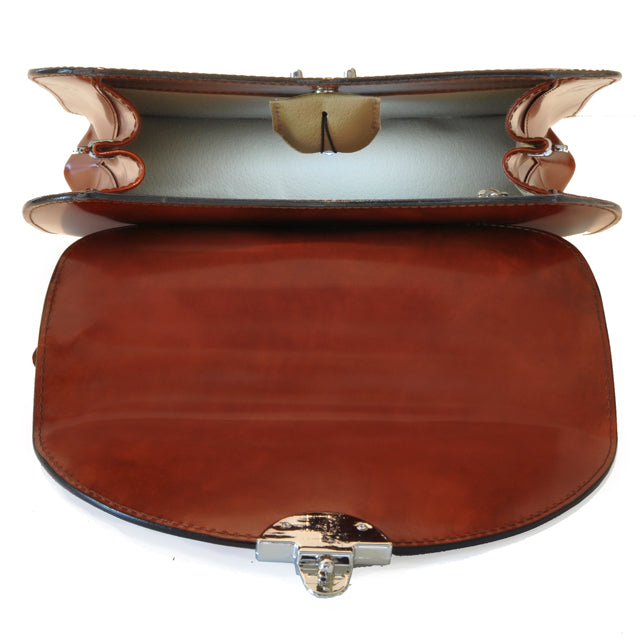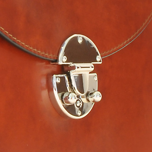 The Veneziano Small features a spacious main compartment, perfect for all your essentials, as well as smaller pockets and a convenient LED light. The neutral colored leather lining adds a touch of elegance to the bag. All hardware, including the leather covered handle, is made of gold-tone brass for a timeless look.