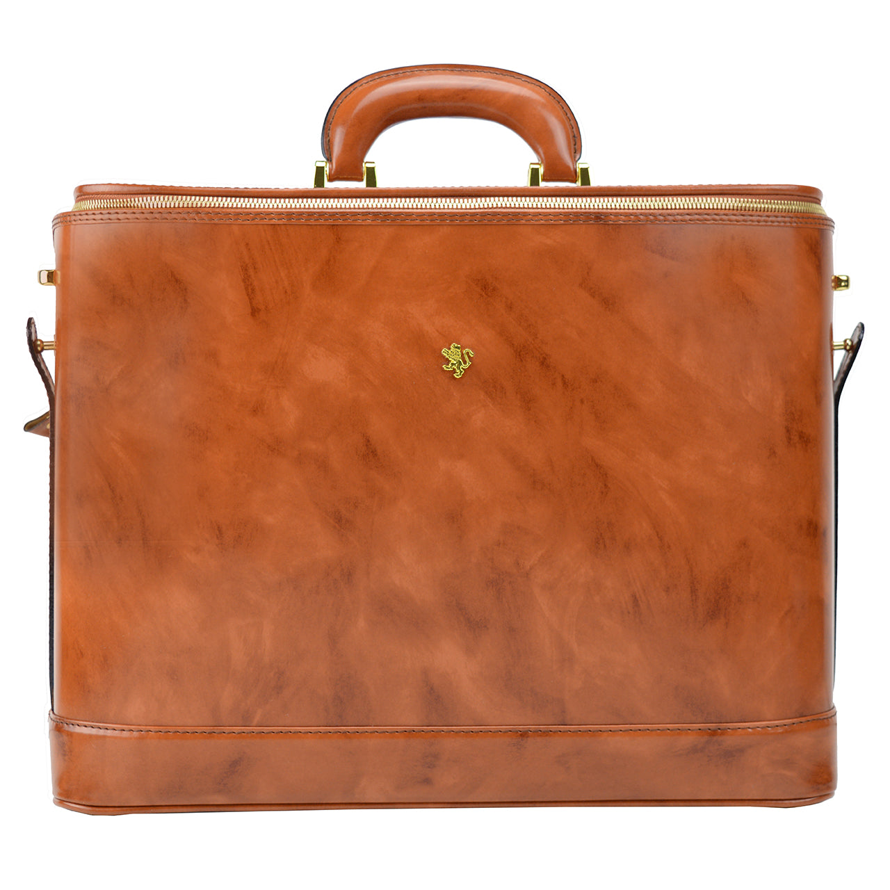 Made of 100% pure and real leather, vegetable tanned, this briefcase has dimensions of 33.00 cm in height, 41.00 cm in width, and 7.00 cm in depth. The highly polished and classy handmade leather is made in Florence, Italy by an established company since 1948. The briefcase can be opened in both ways, as an attach case or like a briefcase. It also features an inside LED light and a zip closure. The light is automatically set to go off after 30 seconds and there are several extra pockets for your mobile phone, business cards, and pen. Other features include a key padlock closure and a removable shoulder strap.